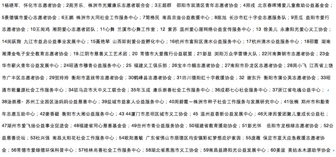 点亮玉树、幕天公益、爷爷奶奶一堂课、古村之友、天使妈妈、友成基金会慕课、人人公益、社创之星,中国好公益平台、滴水公益、公益小天使、农禾之家,善达网、社会创新家、关爱抗战老兵。