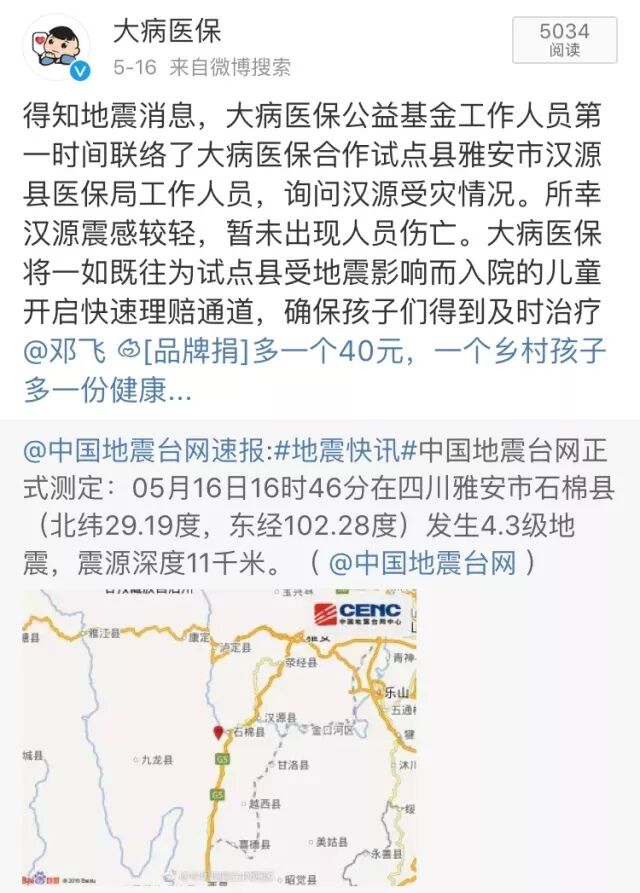 四川省雅安市石棉县发生4.3级地震,“大病医保”工作人员第一时间联络合作试点县雅安市汉源县医保局工作人员,询问汉源受灾情况,并为试点县受地震影响而入院的儿童准备了快速理赔通道。所幸汉源震感较轻,未出现人员伤亡。